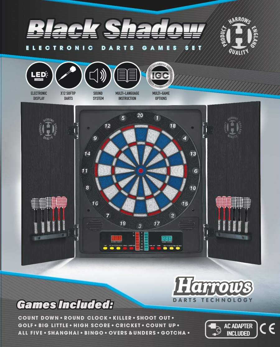 Harrows E-Board Cabinet Set Artikelnummer: 42992Harrows Electro Board Cabinet 18" Electro Board Scheibe 1-8 Spieler + Cricket Funktion inkl. Dartset Adapter 220 V Sofort lieferbar € 99,00€ 149,90 Stück -+