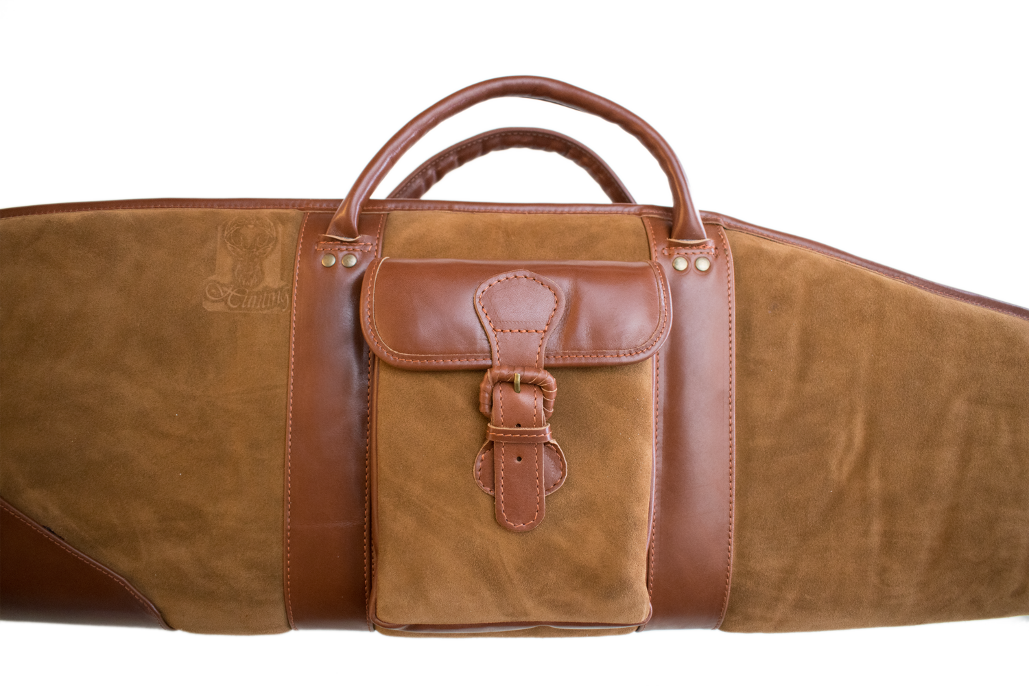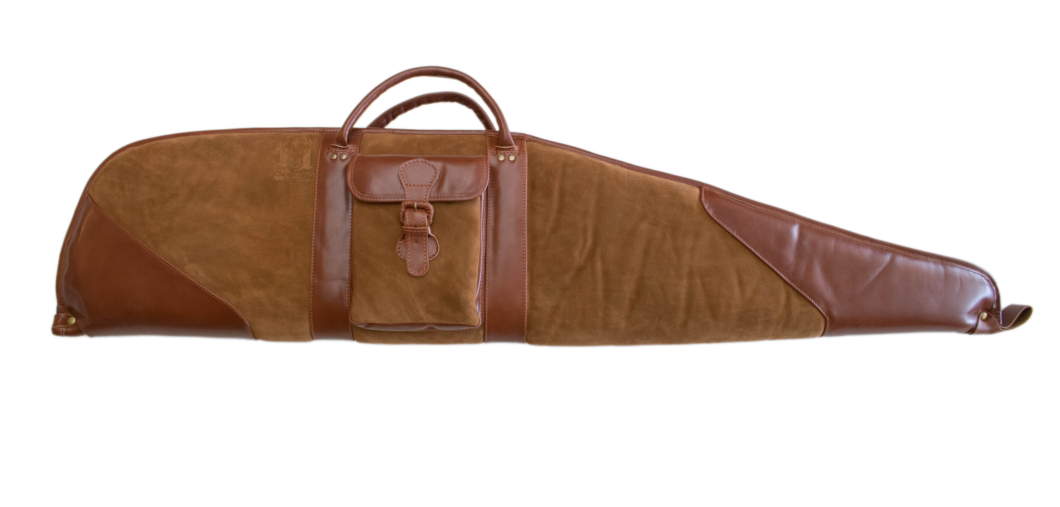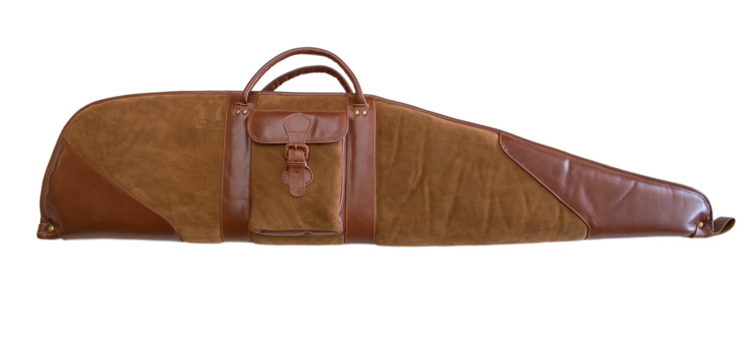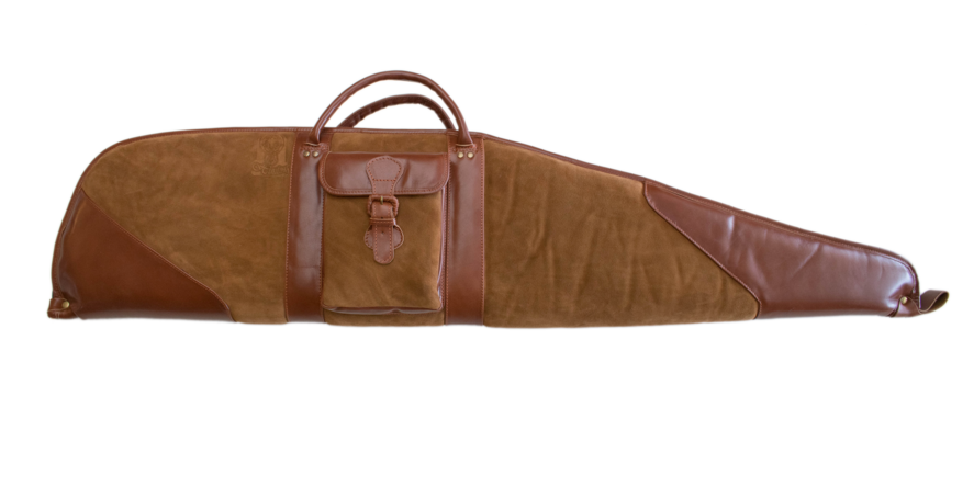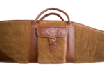 hellbraun teilweise Rauh- teilweise Glattleder zweizipp Reißverschluss. Riemen zum Umhängen seitliche Außentasche. Sehr hochwertige Ausführung. Top Preis Leistung. Geeignet für Waffen mit und ohne Zielfernrohr.