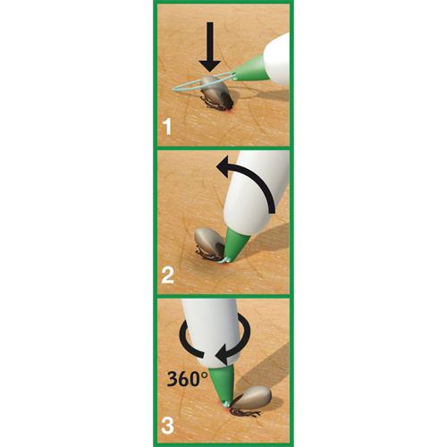 den Druck auf den hinteren Teil lösen, den Stift gerade stellen und die Zecke mit einer leichten Umdrehung entfernen. Dauer: weniger als eine Sekunde.