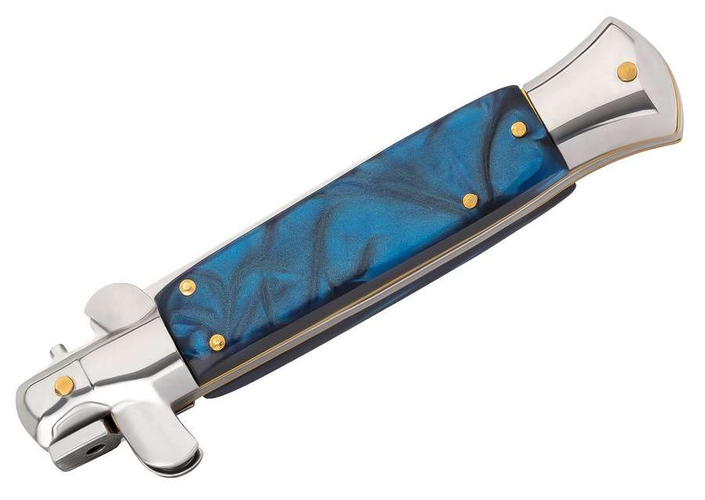 Die Klinge des Herbertz Springmessers ist aus rostfreiem AISI 420 Stahl gefertigt. Die sichere Handhabung wird durch eine zuverlässige Verriegelung gewährleistet. Diese kann durch das Verschieben des Edelstahlelements am Übergang zwischen Griff und Klinge gelöst werden. Die Griffschalen sind aus blauem Kunststoff gefertigt.