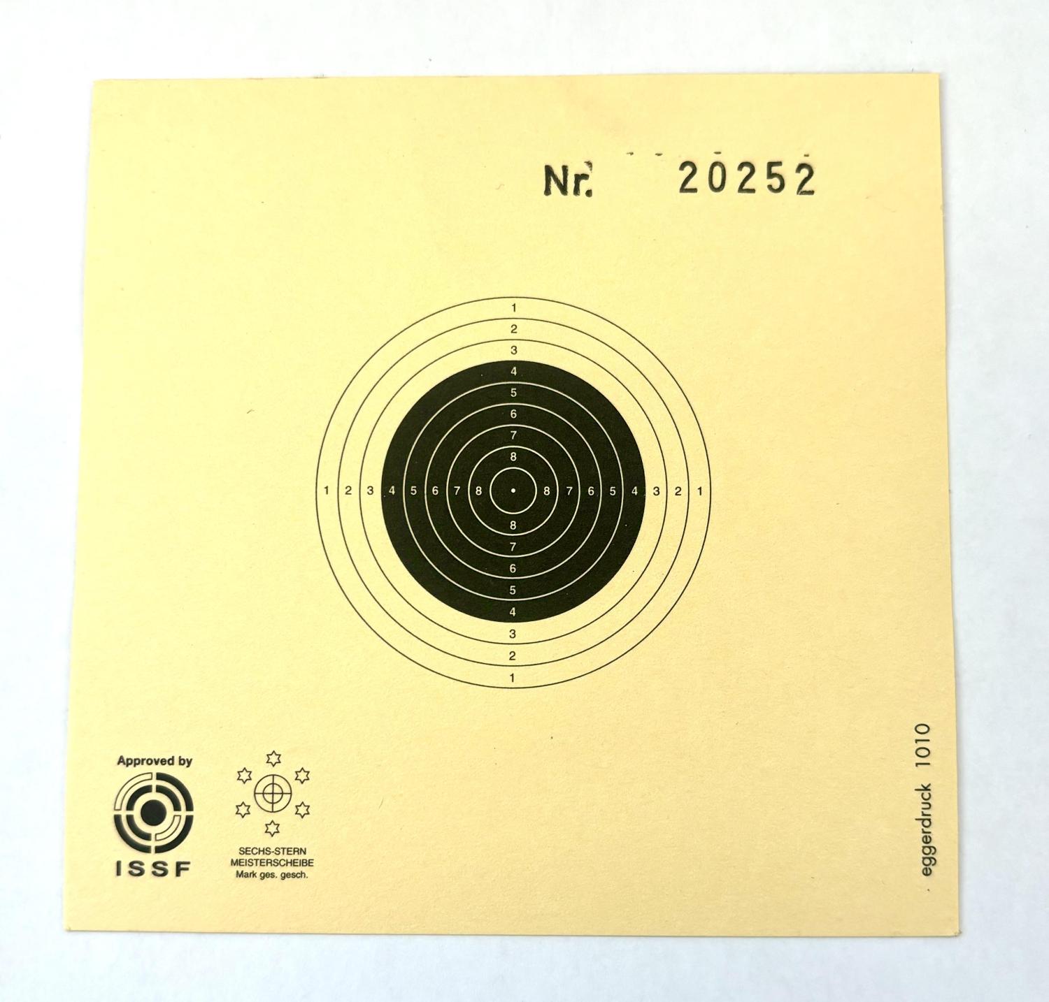 Artikelnummer: 60103001 Approved by ISSF Sechs-Stern Meisterscheibe Luftgewehrscheibe mit Nummer in schwarz (1010-N) Entfernung: 10 m Format: 10 x 10 cm Spiegel schwarz: Ø 30,5 mm Farbe: schwarz Sofort verfügbar € 4,00 - + Stück